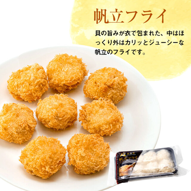| 原材料 | ホタテ(青森県産)、衣(パン粉、小麦粉、コーンフラワー、タピオカでん粉、食塩、砂糖)、(一部に小麦粉を含む) |