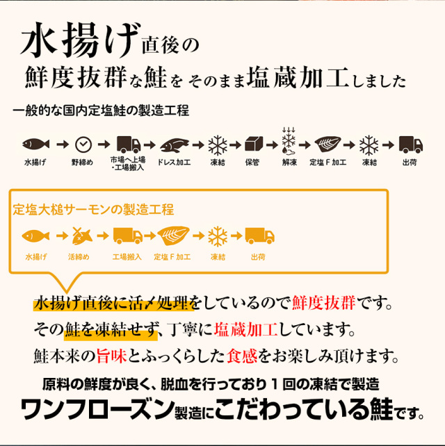 | 原材料 | 銀鮭(岩手県産/養殖)、食塩/酸化防止剤(V.C、チャ抽出物) | 保存方法 | 要冷凍(-18℃以下で保存) |