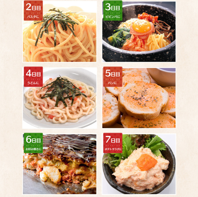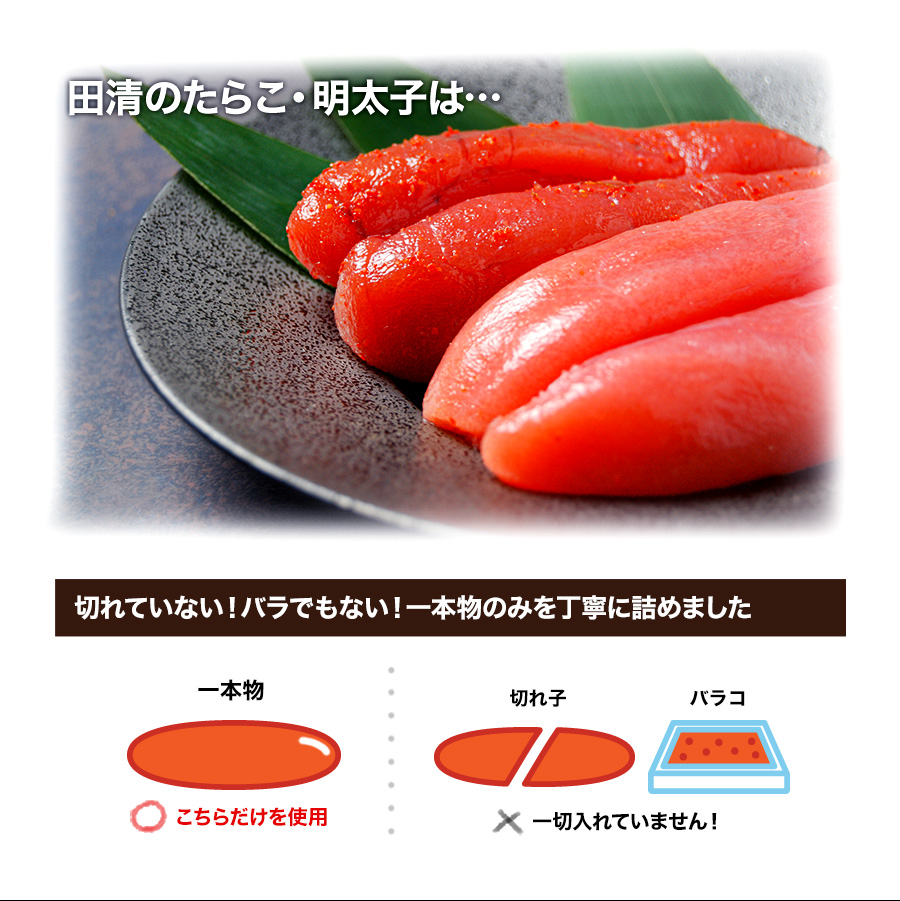 | 原材料 | すけとうだらの卵(ロシア、アメリカ産)、食塩、酵母エキス、調味料(アミノ酸)、酸化防止剤(V.C)、ナイアシン、発色剤(亜硝酸Na)、酸素、ソルビット、本みりん、調味料(アミノ酸)、唐辛子 |